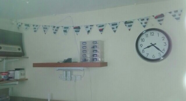 Just a brief update on the railway bunting I did for my father's birthday in May. He put it up in the room he uses for his model railway a while back but I forgot to post a pic of it in situ.